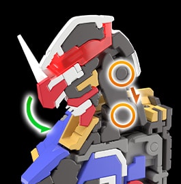 頸關節可動機構為雙重活動軸+球形關節的設計。這是著重於擺出上仰動作的構造,能藉此重現飛翔場面等充滿躍動感的架勢。