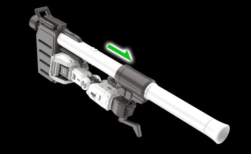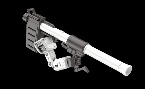 超絕火箭砲採用了能讓砲管伸長的滑移構造。受惠於這個新構造,就算是在手臂伸直的情況下,也照樣能擺出將超絕火箭砲扛在肩上的動作,能藉此營造出使勁扛起的姿勢。