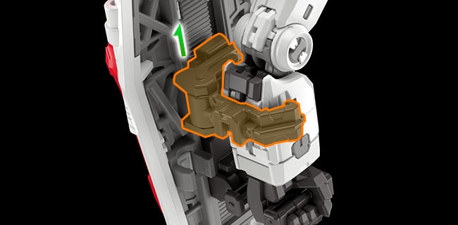側裙甲/後裙甲採用了將基座部位夾組在外裝零件和骨架之間的扣鎖構造。在避免零件脫落之餘,亦能提高可靈活而擺設動作的幅度。