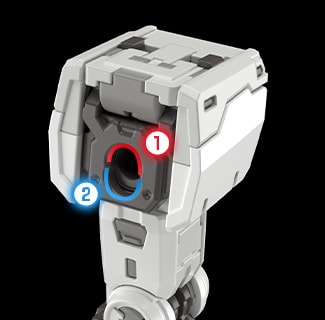 在以設定為準的情況下,手肘和膝蓋等關節在活動時應該要以圓筒形零件為中心軸才對。不過以往的鋼彈模型多半都重新詮釋過該關節構造,為了擴大可動範圍而採用了偏離原意的設計。本商品則是以回歸原點為準,在確保具備十足可動範圍的前提下,採用了以該圓筒形零件位置為軸,透過轉動方向完成組裝的新機構「轉動式連接結構」。